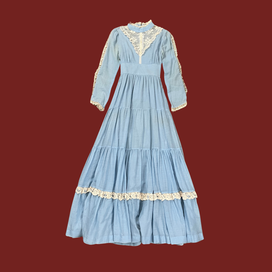 (S) 70s Blue Long Sleeve Prairie Maxi Dress