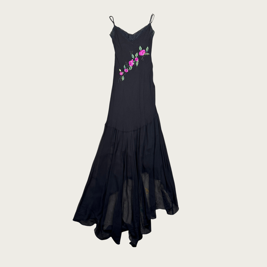 (S) 90s/Y2K Marina Bresler Black Silk Beaded Floral Embroidered Dress
