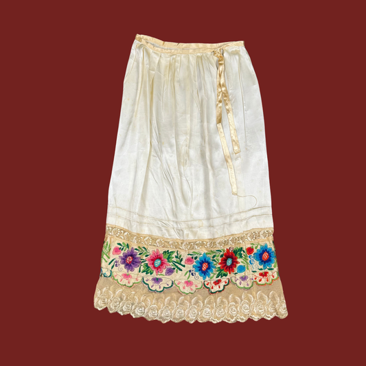 (27") 1970s Traditional Yucatan Floral Embroidered Satin Skirt