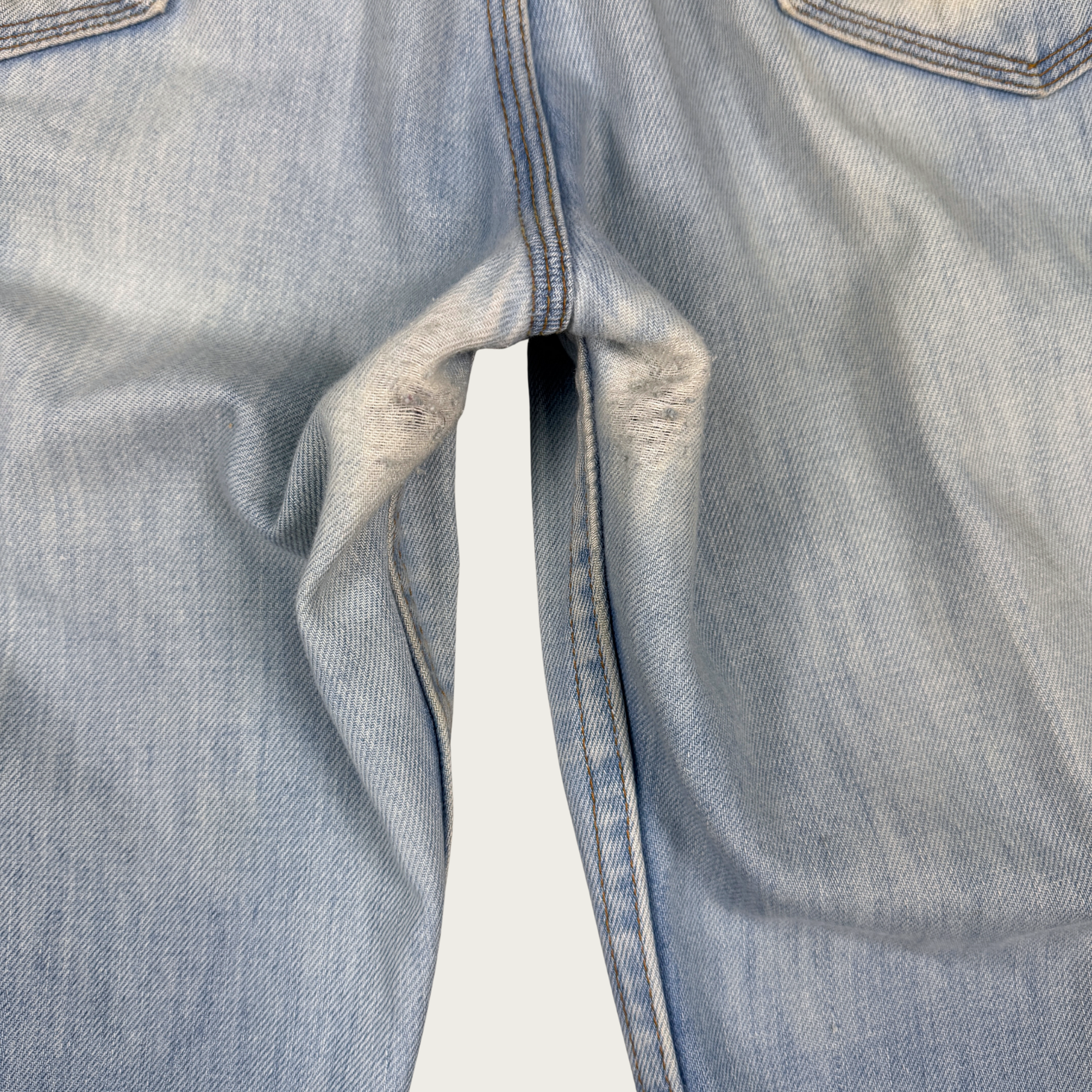 Condition: Good, has some light stains and some light friction distressing on the inner thigh/crotch area as shown.