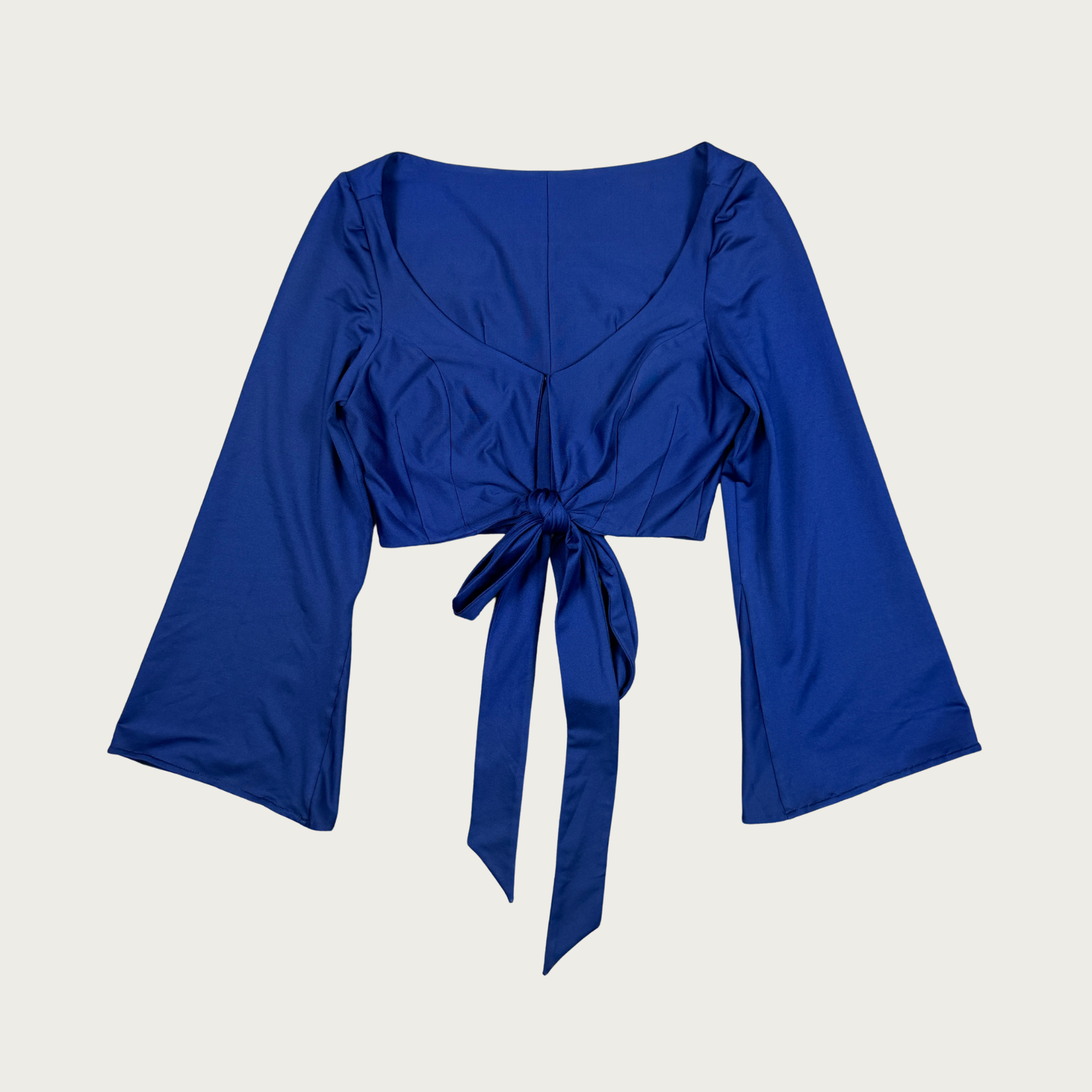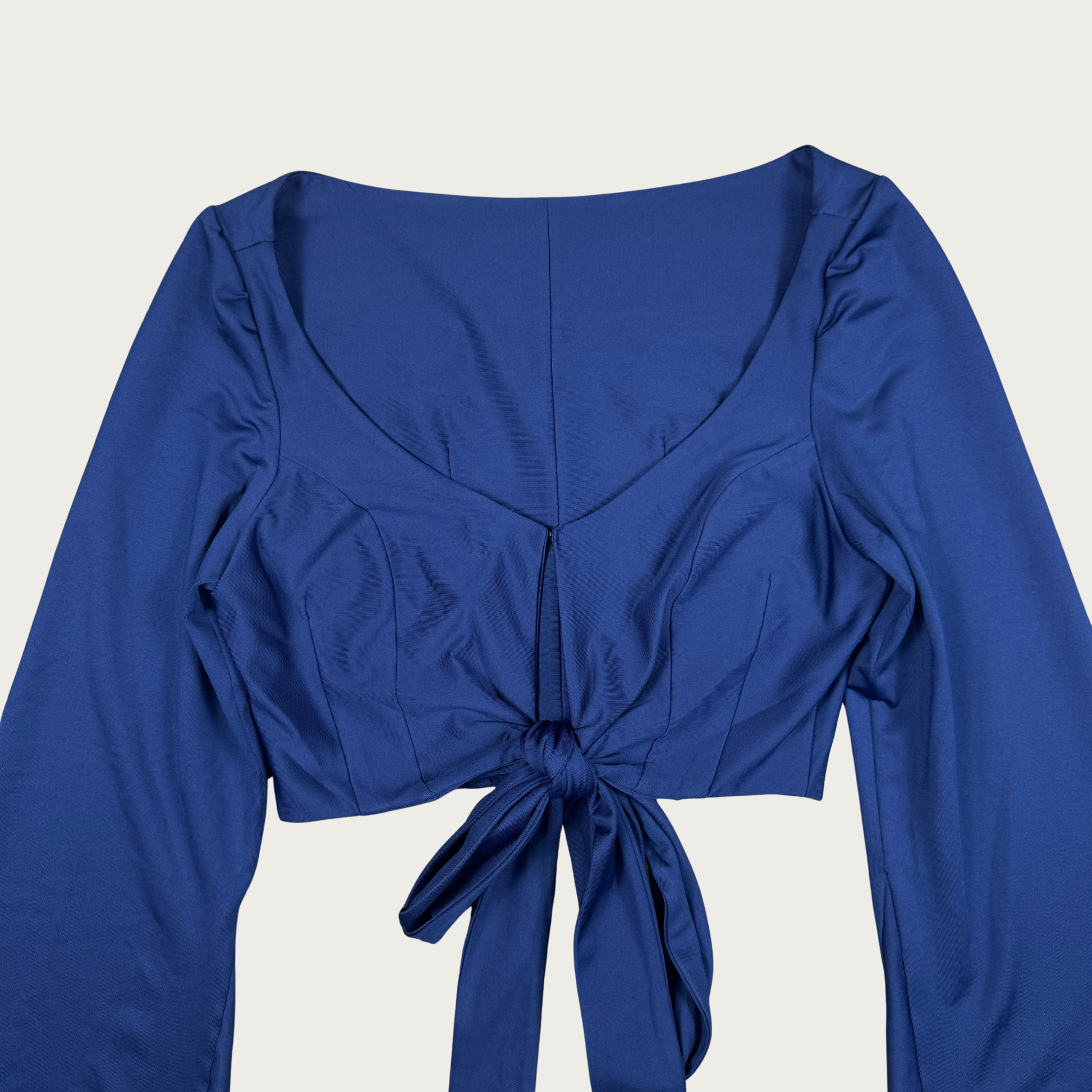 (M) 70s Navy Bell Sleeve Tie Front Crop Top